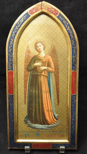 Antique Gothic Florentine Arched Frame w Angel Minstrel Print VTG Blue Red Gold