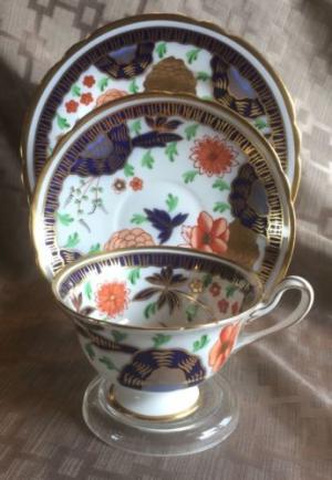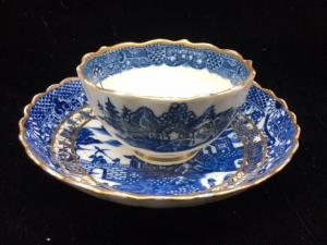 ANTIQUE ORIENTAL BLUE & WHITE WILLOW W/ GOLD CUP & SAUCER - CAUGHLEY ?