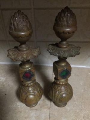 Pair of Antique Ornate Brass Finials with Glass Gems and Pineapple tops 9" tall