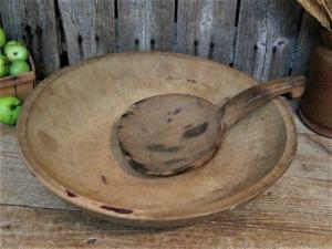 AAFA Early Antique Primitive Wood Dough Bowl w/ Rim & Hooked Scoop 13"