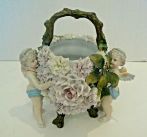 ANTIQUE DECORATIVE GERMAN PORCELAIN FLOWER ENCRUSTED CHERUB BASKET VASE