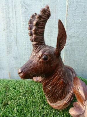 SUPERB 19thC BLACK FOREST WOODEN OAK CARVING: DEER TYPE HEAD WITH ANTLERS c1880s