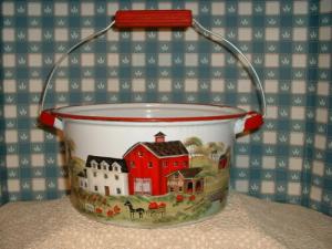 VINTAGE WHITE & RED TRIM ENAMELWARE COUNTRY FARMS, COWS, FOLK ART HAND PAINT