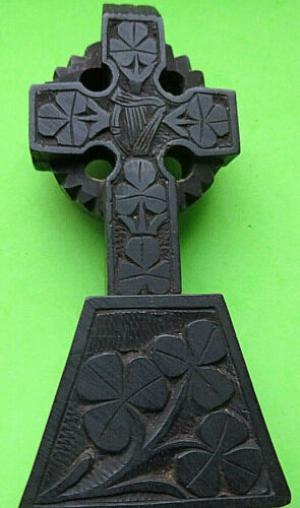 ANTIQUE IRISH CARVED SHAMROCKS & HARP BOG OAK CARVED CROSS,READS "KILARNEY"