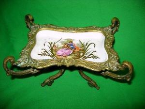 Antique Sevres France Dish Ormolu Mount Frame Fragonard Lovers Hand Painted
