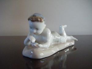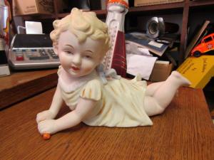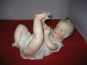 VINTAGE BISQUE PIANO BABY FIGURINE - SIGNED 23/542- 9.5" LONG X 6" TALL