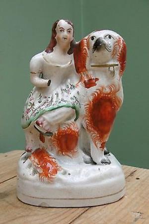 SUPERB MID 19thc STAFFORDSHIRE OF GIRL SITTING ON RED & WHITE DOG: OPEN LEG