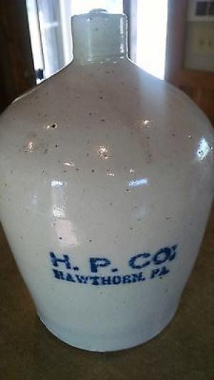 Antique Primitive Half Gallon Stoneware Jug H.P. CO. HAWTHORN PA Blue Decor