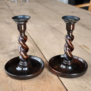 Pair Antique English Mahogany Barley Twist Candlesticks w/ Metal Bobeches