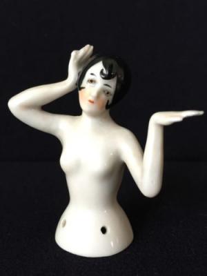 2-1/2" Antique German Porcelain Flapper Half Doll Pincushion Doll - Arms Away