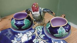 SUPERB 19thc GEORGE JONES MAJOLICA STRAWBERRY DISH WITH BIRD