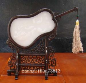 Fan-shaped Handmade Wood & White Jade Inlaid Screen Fish Lotus Deco Art 连莲有余