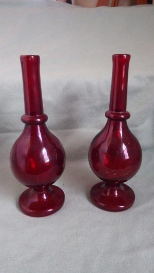 PAIR ANTIQUE BOHEMIAN PERSIAN TURKISH HARRACH HAND PAINTED GLASS VASE DECANTER
