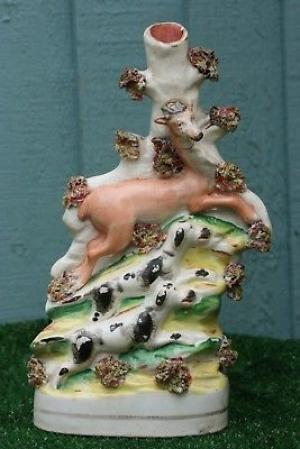 MID 19thC STAFFORDSHIRE OF DEER FIGURE, PAIR OF HUNTING DOGS, SPILL VASE c1860s