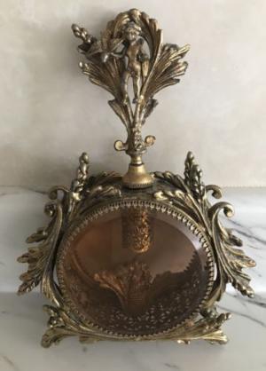 Vintage Ormolu Gold CHERUB PERFUME BOTTLE Beveled Amber Filigree Glass