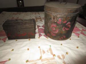 2 ANTIQUE HAND PAINTED TIN TOLEWARE CANISTER w/LID and DOCUMENT BOX