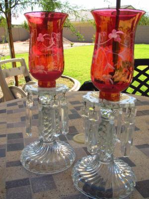 Cranberry Glass Hurricane Candle Lamps with Prisms Grape Design