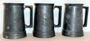 3 ANTIQUE Pewter TANKARDS w Hand Engraved 4-Toed DRAGONS, Marked “SOON HOWLON”