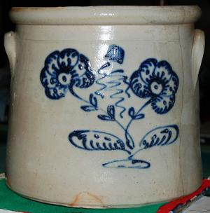Antique 4 Gal. Stoneware Crock With Magnificent Cobalt Blue Flowers: Has Crack