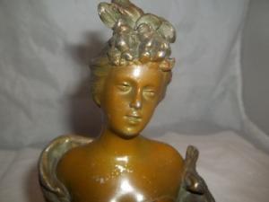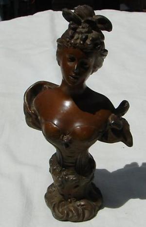 Antique French Art Nouveau Lady Feathers in Hair Bronzed Spelter Lady Bust