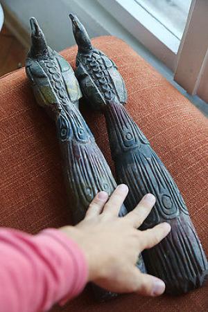 STUNNING Peacocks Antique Carved Wood Figurines 1900s 2 Male Female Europe Rare