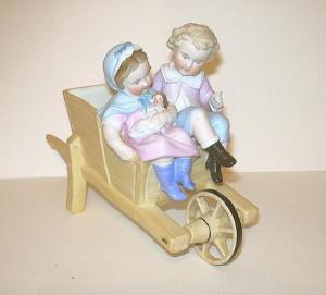 ANTIQUE BISQUE FIGURINE 2 TOTS IN WHEELBARROW FANTASTIC NR