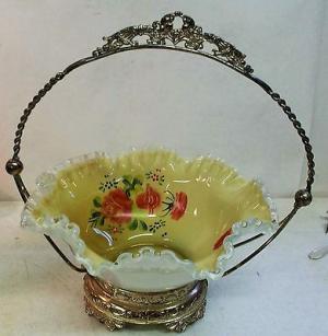 Antique Cased Glass Hand Painted Ruffled Brides Basket & Silverplated Holder