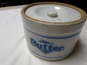 Antique Blue & White Salt Glazed Stoneware Butter Crock w/ Lid
