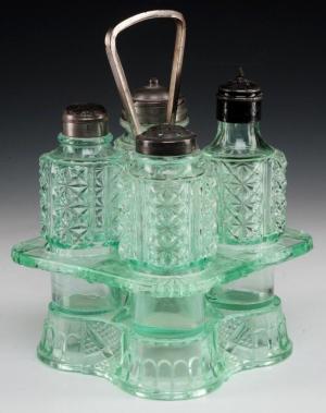 Antique ADAMS "Ashman" Green Vaseline Glass CONDIMENT SET, Salt, Pepper, Sugar