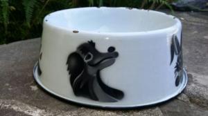 Antique / Vintage dog puppy food / water dish / bowl enamel decorated metal