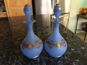 ANTIQUE PAIR BLUE OPALINE Gold Enamel PERFUME SCENT BOTTLE French Bohemian