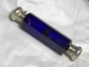Antique Etched Gilt Silver Sapphire Blue Beveled Glass Double Ended Scent Bottle