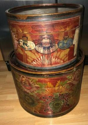 2 VINTAGE ROUND BENT WOOD CHEESE ? LARGE STORAGE BOXES LIDDED LOT PAINTED