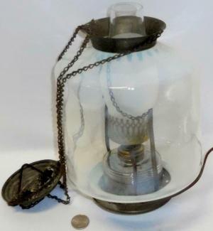 Antique Victorian c. 1880 Opalescent Coin Dot Glass Hanging Oil Lamp