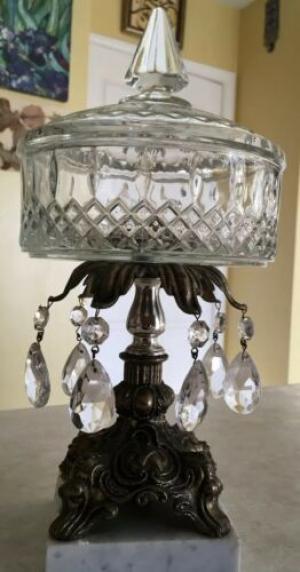 Vintage Clear Glass, Marble &Brass Pedestal Compote Candy Dish w/ Crystal Prisms