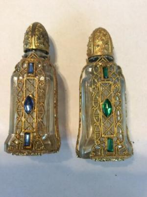 Pair Czech Gilt Brass Filigree Glass Perfume Bottles Jeweled Blue Green #12