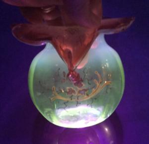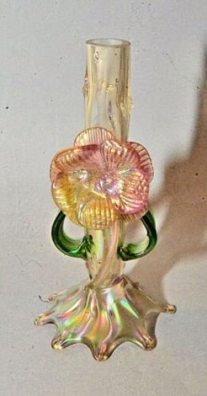 Antique Victorian Art Glass Vase Iridescent w/ Pink Flower & Green Leafy Handles