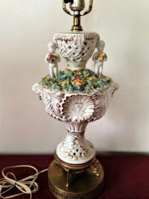 Vintage Italian Pierced Porcelain Table Lamp With Garden Scene & Cherubs