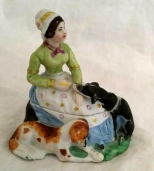 Antique WOMAN RELAXING reading a BOOK w her 2 DOGS FAIRING TRINKET BOX