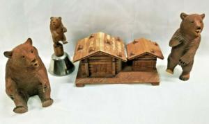 Antique Hand Carved Swiss Wood Bear w/ Glass Eyes Black Forest lot of 4