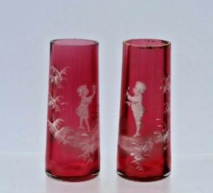 Antique Pair of Mary Gregory Cranberry Cabinet Vases White Enamel Children