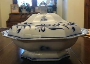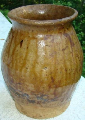 ANTIQUE OVID SHAPED STONEWARE CROCK WITH COBALT FLOWER