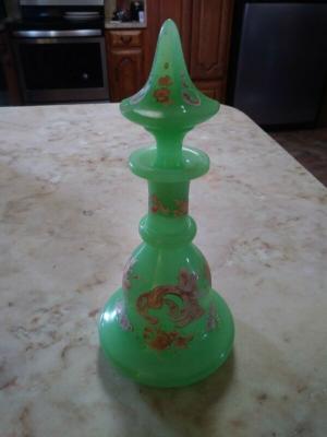 Hand Painted Green Opaline Perfume Bottle with Stopper 8 1/4" tall