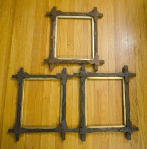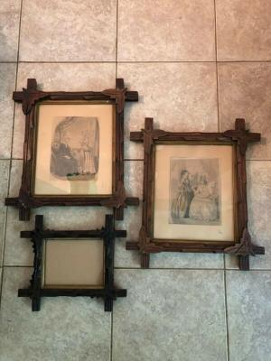 set of 3 antique Adirondack black forest tramp art frames with prints c 1880’s