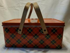 VINTAGE RED PLAID TIN PICNIC BASKET/CONTAINER WITH WOODEN HANDLES
