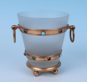 Antique Italian Jeweled Bronze Mounted Small Glass Cachepot Vase Vintage Ormolu