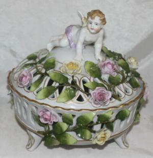 Von Schierholz Porcelain Reticulated Covered Footed Bowl with Flowers and Cherub