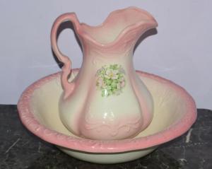 Vintage Ironstone England 1890 Pitcher & Bowl Wash Basin Pink Floral Pattern 14"