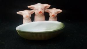 RARE MINT VICTORIAN GERMAN PIG FAIRING 3 pigs looking in a basket {NOT TROTH}