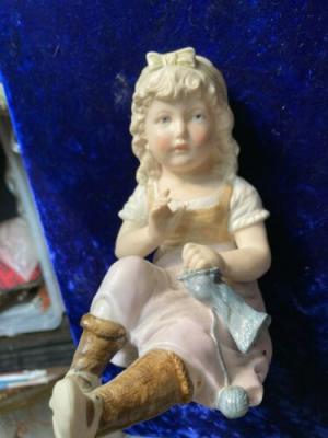 GERMAN BISQUE BLUE EYED Girl SITTING 6" PIANO BABY knitting darning sock #3541